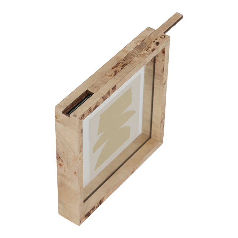 De vierkante vorm houdt het strak en eenvoudig, terwijl de warme, natuurlijke kleur net genoeg zachtheid toevoegt. Voor de foto zit een glazen plaat, zodat je beeld helder blijft en tegelijk beschermd is tegen dagelijkse stofvingers.