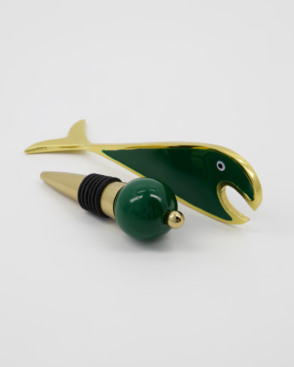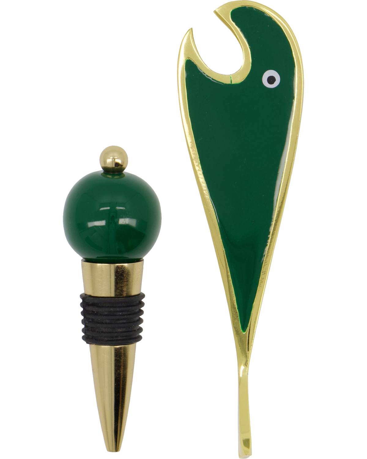 Geef je huisbar een stijlvolle upgrade met deze elegante set baraccessoires van House Doctor. De set bestaat uit een visvormige flesopener en een verfijnde flessenstop, beide uitgevoerd in een luxueuze goudkleurige en groene afwerking met subtiele zandkleurige accenten. Dankzij het slimme ontwerp en de hoogwaardige materialen zijn deze accessoires niet alleen functioneel, maar ook echte blikvangers. Ideaal voor gezellige avonden of als een stijlvol cadeau voor elke gelegenheid.