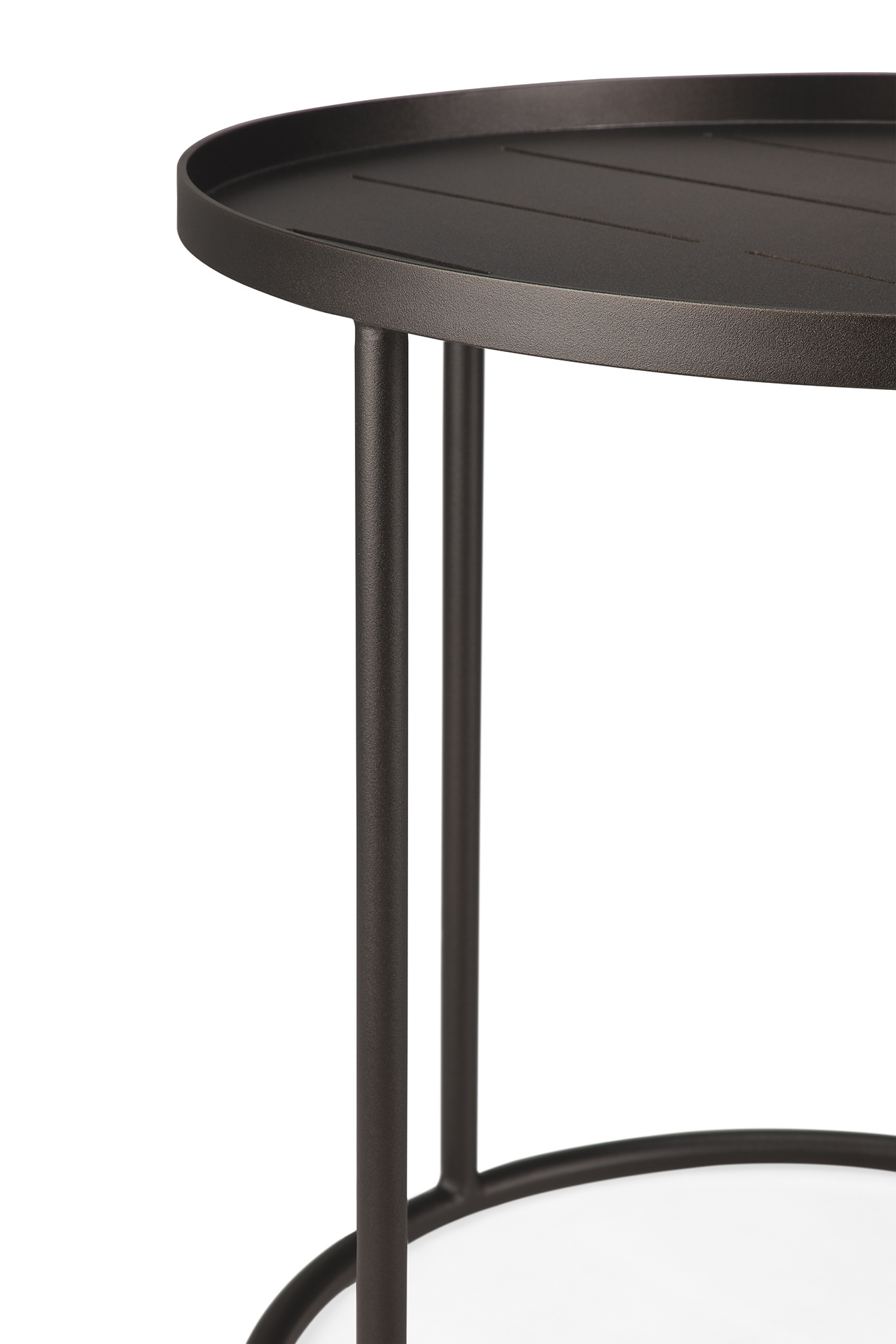 De Ethnicraft Outdoor dienblad bijzettafel in aluminium dark bronze is een ronde buitentafel met bladrand, gemaakt om binnen- en buitendienbladen te dragen en tegelijk strak en licht te blijven ogen. Lees meer