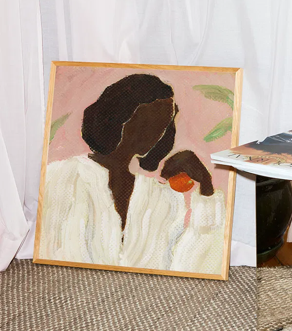 Deze art print is een perfecte keuze voor liefhebbers van moderne wanddecoratie met een zachte, vrouwelijke toets. Dankzij het kleurenpalet in roze, groen, wit en oranje brengt deze illustratie niet alleen warmte, maar ook een speels accent in je interieur. Combineer de print met een naturel houten kader of een kleurrijke lijst voor extra contrast.