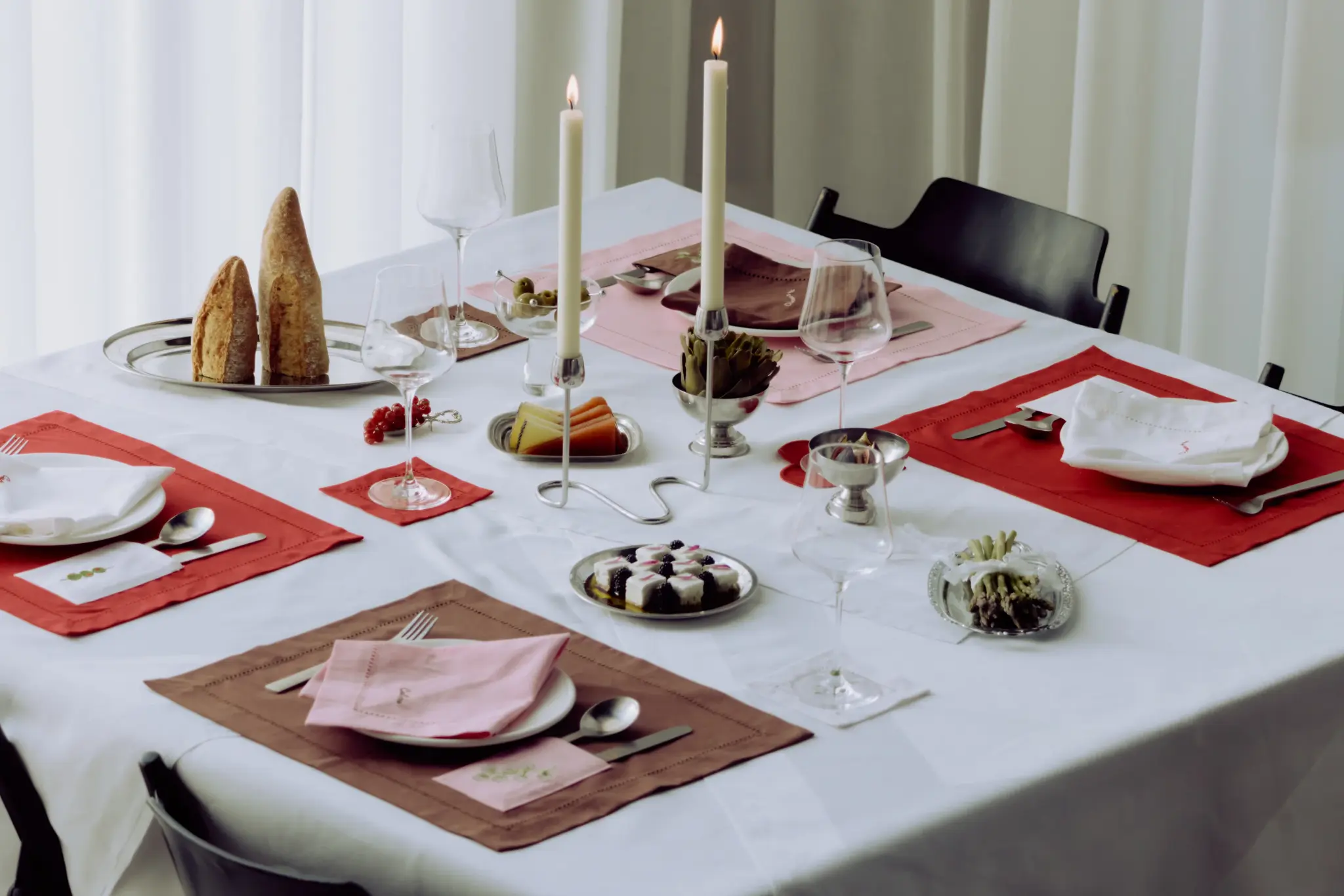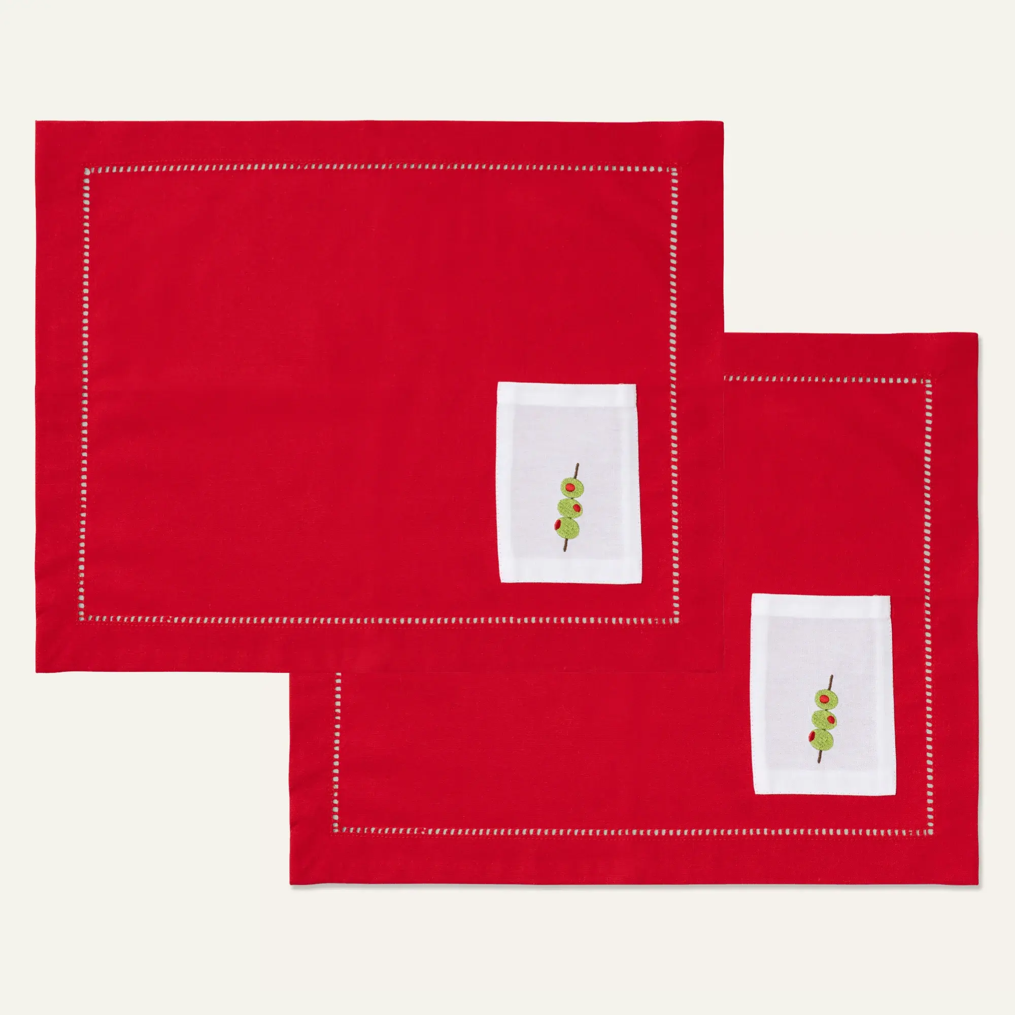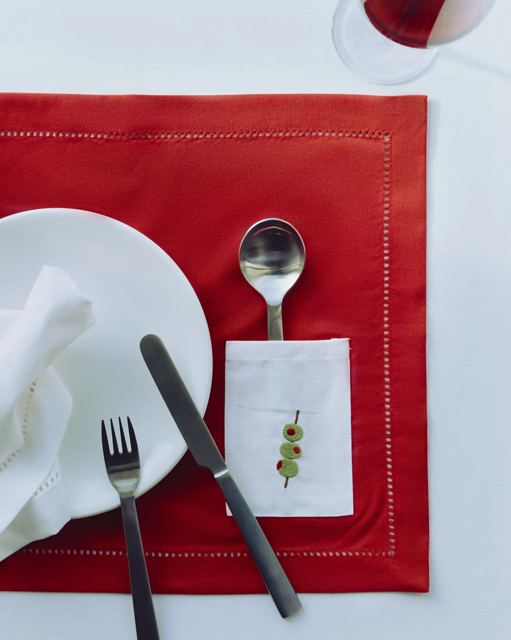 Deze placematset van Kulu Club x Fabienne Chapot is een ode aan samen tafelen — kleurrijk, feestelijk en met een vleugje humor. De felrode kleur, de verfijnde hemstitch rand en het witte bestekzakje met geborduurd olijfje creëren een opvallend, vrolijk en tegelijk chic geheel.