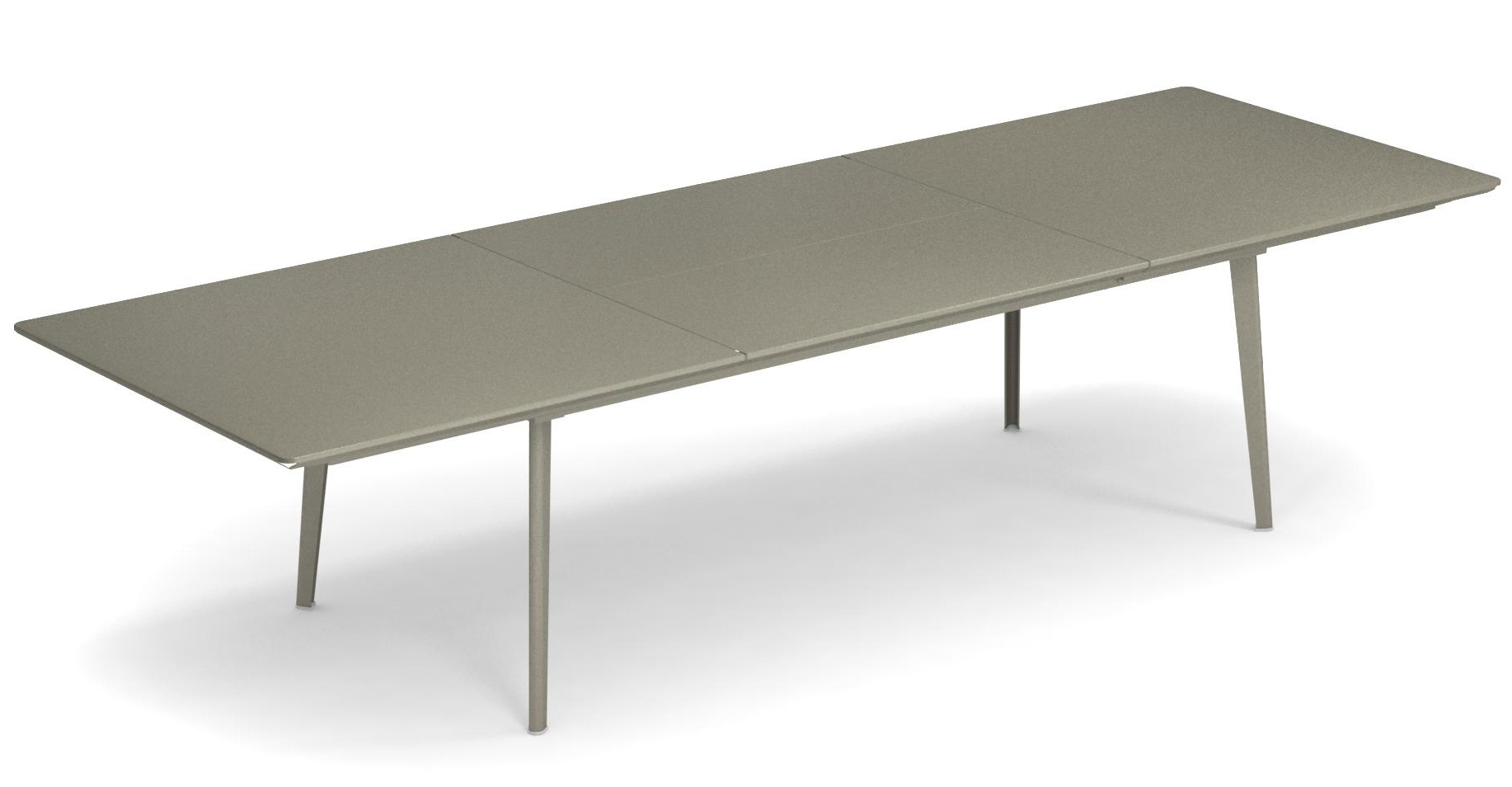 Het oppervlak van de Plus4 tuintafel is gemaakt van geperst staal, met zorgvuldige afwerking voor een beter esthetisch effect. De rails zijn speciaal door EMU voor de Plus4 collectie ontworpen om de tuintafel te kunnen verlengen.