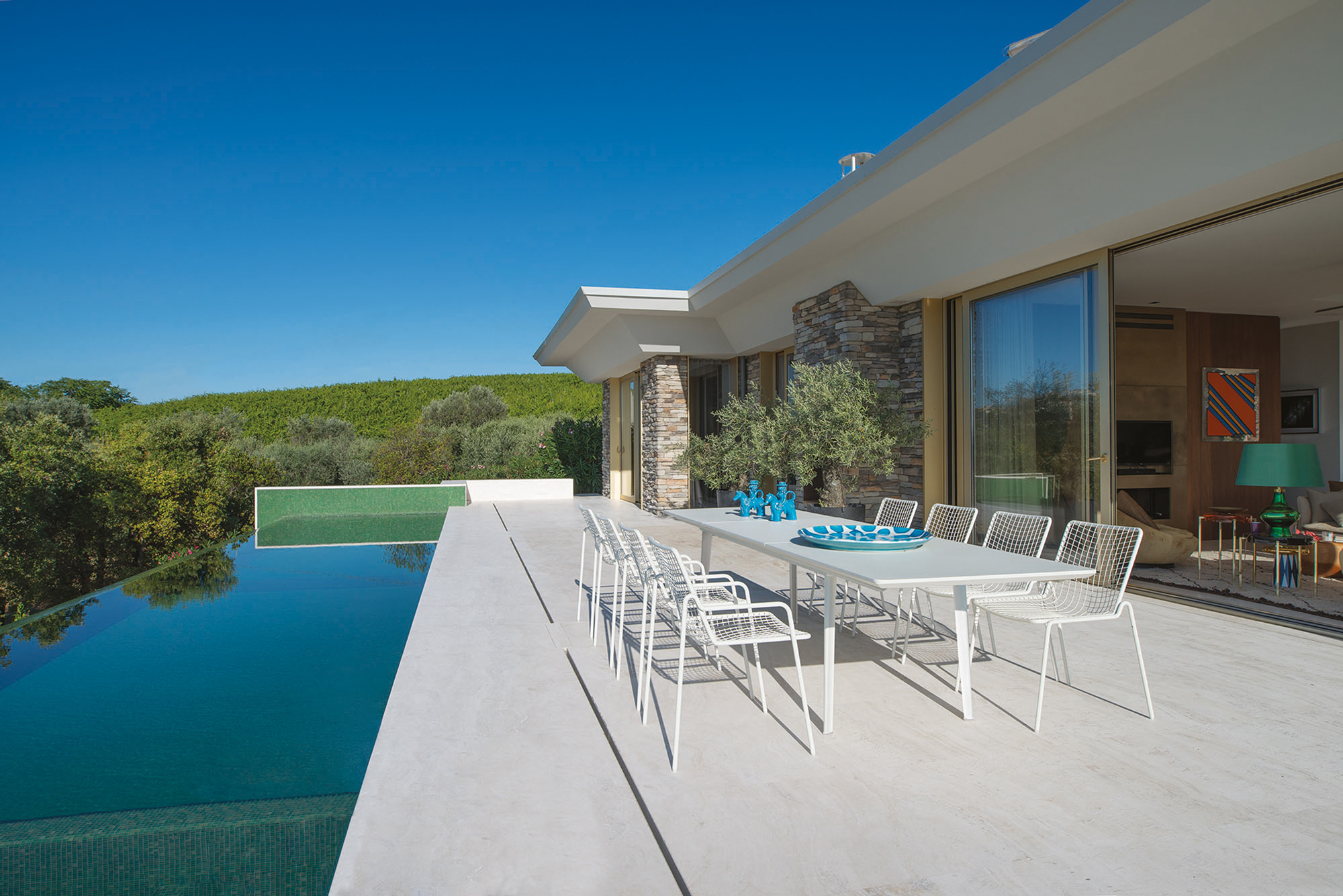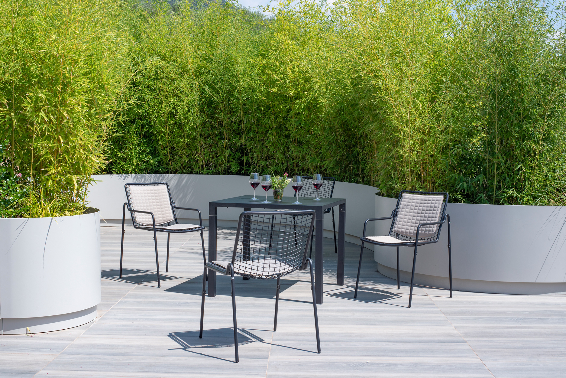 De Rio R50 tuinstoel tuinstoel staat mooi bij de Terramare tuintafel, de Plus4 tuintafel en de Star tuintafel van Emu.