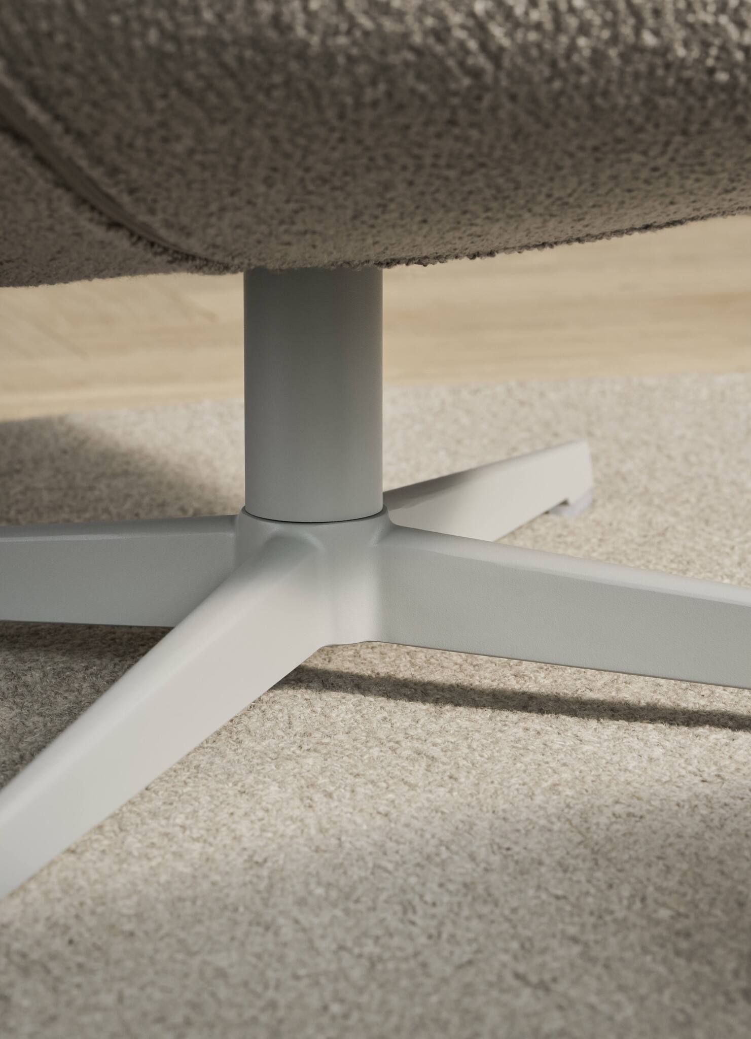 De Ascot-stof is een fijn geweven bouclé met een zachte, volle textuur. De beige tint voelt warm en tijdloos aan en laat zich makkelijk combineren met hout, textiel en natuurlijke kleuren. Dankzij de slanke, grijs gelakte stalen poot behoudt de fauteuil een lichte, elegante uitstraling.