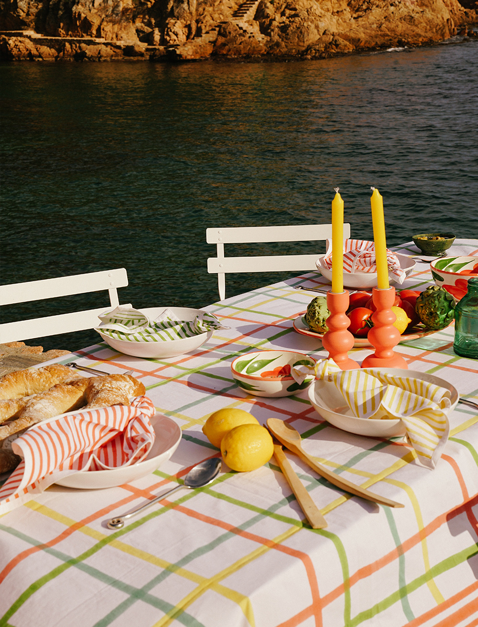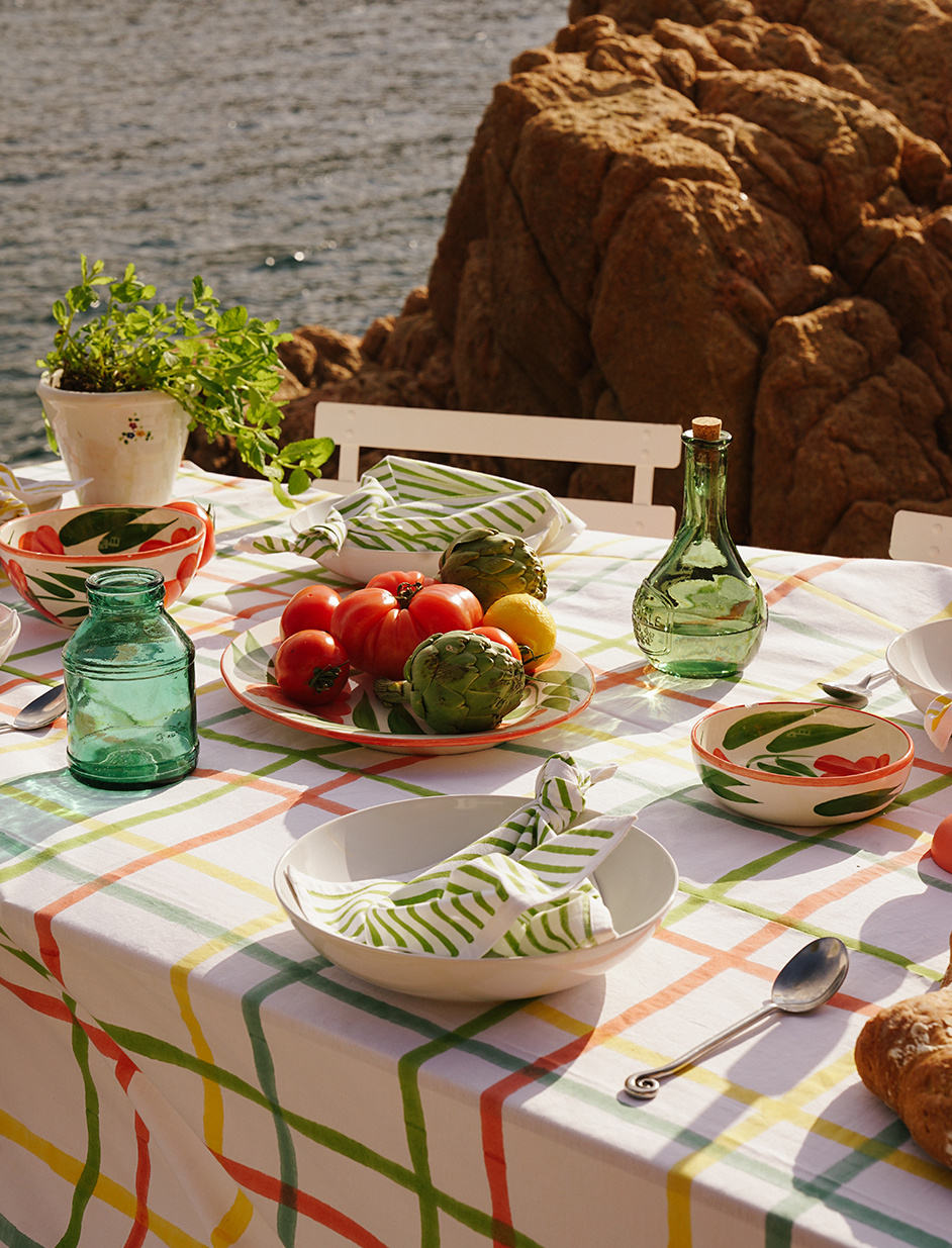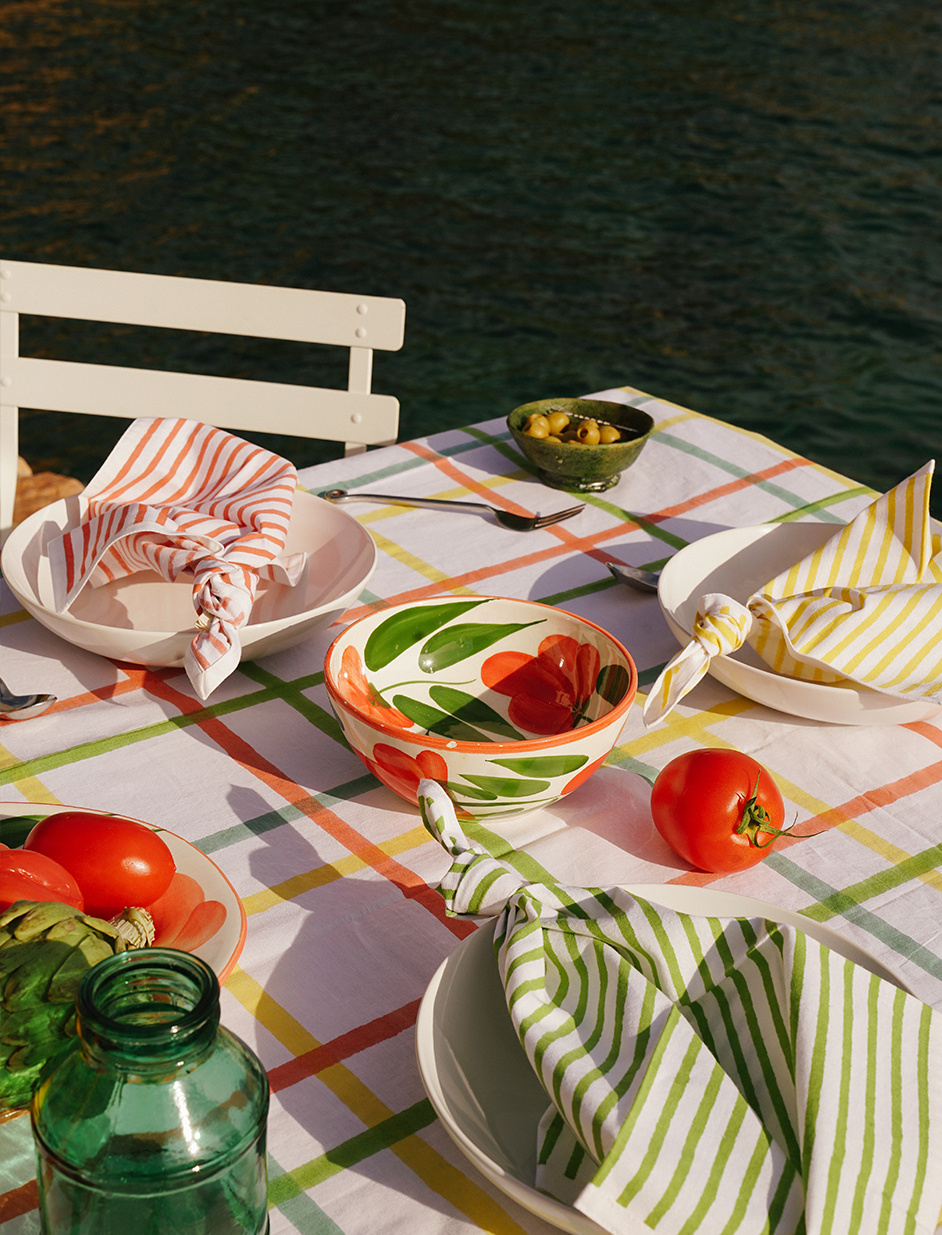 Het Rothko tafelkleed van Maison Dînette is met de hand vervaardigd van natuurlijk katoen en bedrukt via de traditionele blockprint-techniek. De warme perzikkleur brengt een gevoel van rust en lichtheid aan tafel – ideaal voor zonnige lunches en lange diners. Elk stuk draagt de unieke charme van ambachtelijk textiel, met kleine imperfecties die het karakter juist versterken.