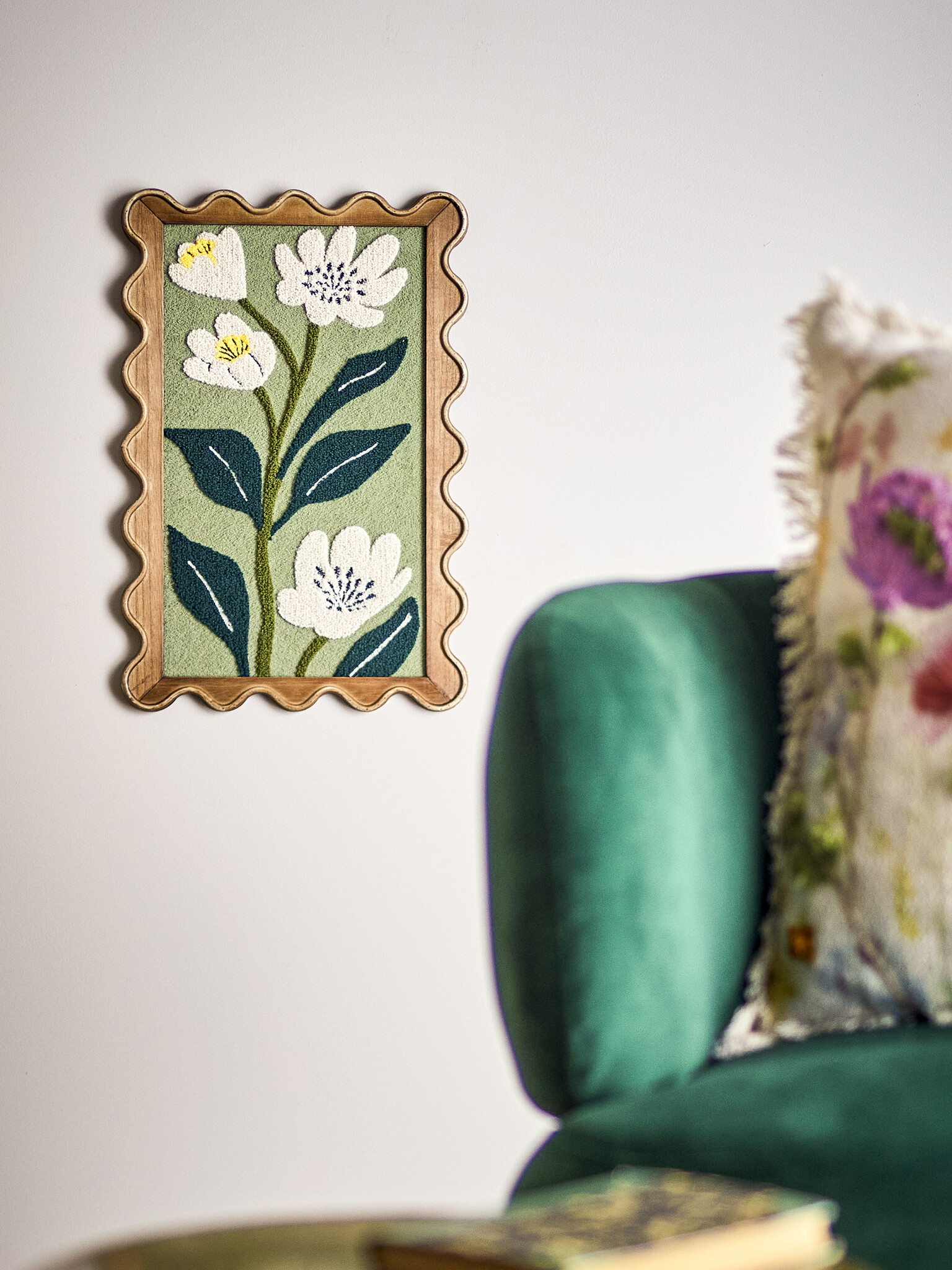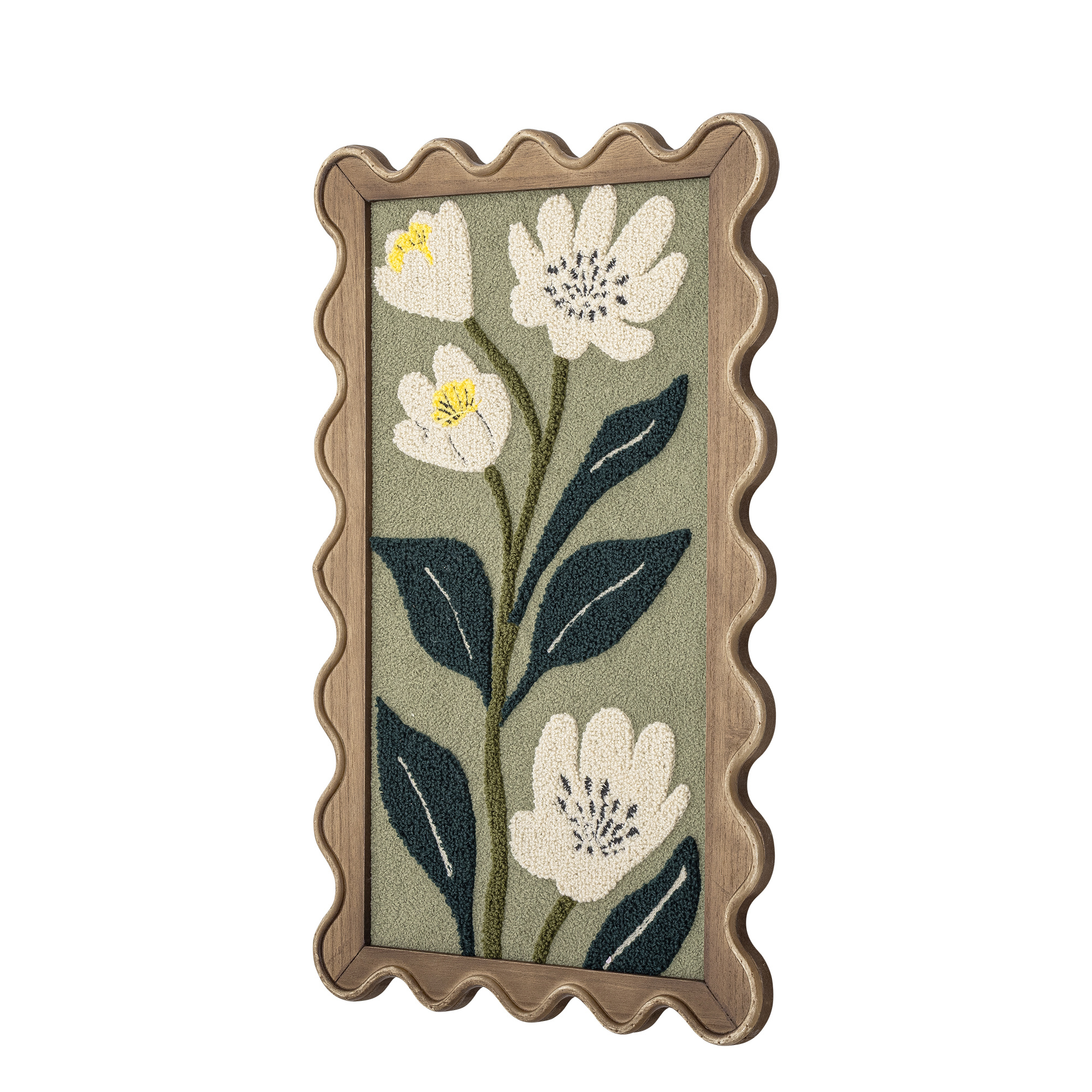 De Talan illustration is meer dan een klassiek kunstwerk: het combineert beeld en materiaal op een subtiele manier. Het geborduurde bloemenmotief geeft diepte en reliëf, terwijl de zachte kleuren zorgen voor een kalme, natuurlijke uitstraling. De licht golvende lijst voegt speelsheid toe zonder te overheersen.