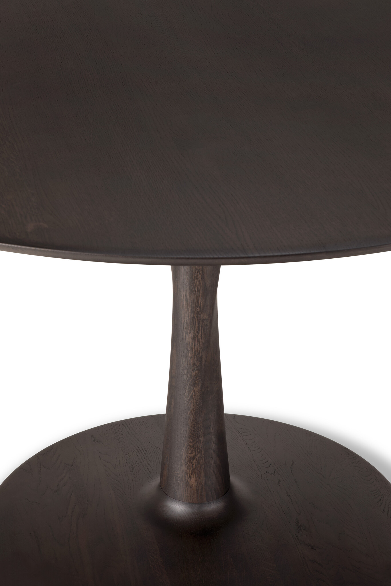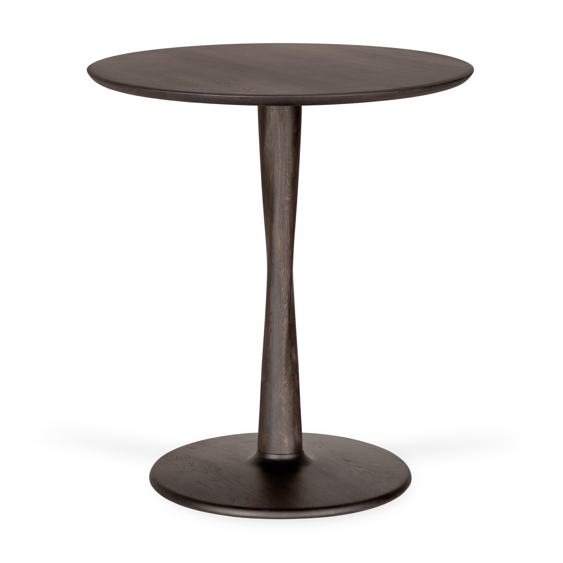Ethnicraft Torsion ronde eettafel Ø 70 cm in bruin gekleurd eikenhout met sculpturale basis, compact en elegant voor twee personen. Lees meer