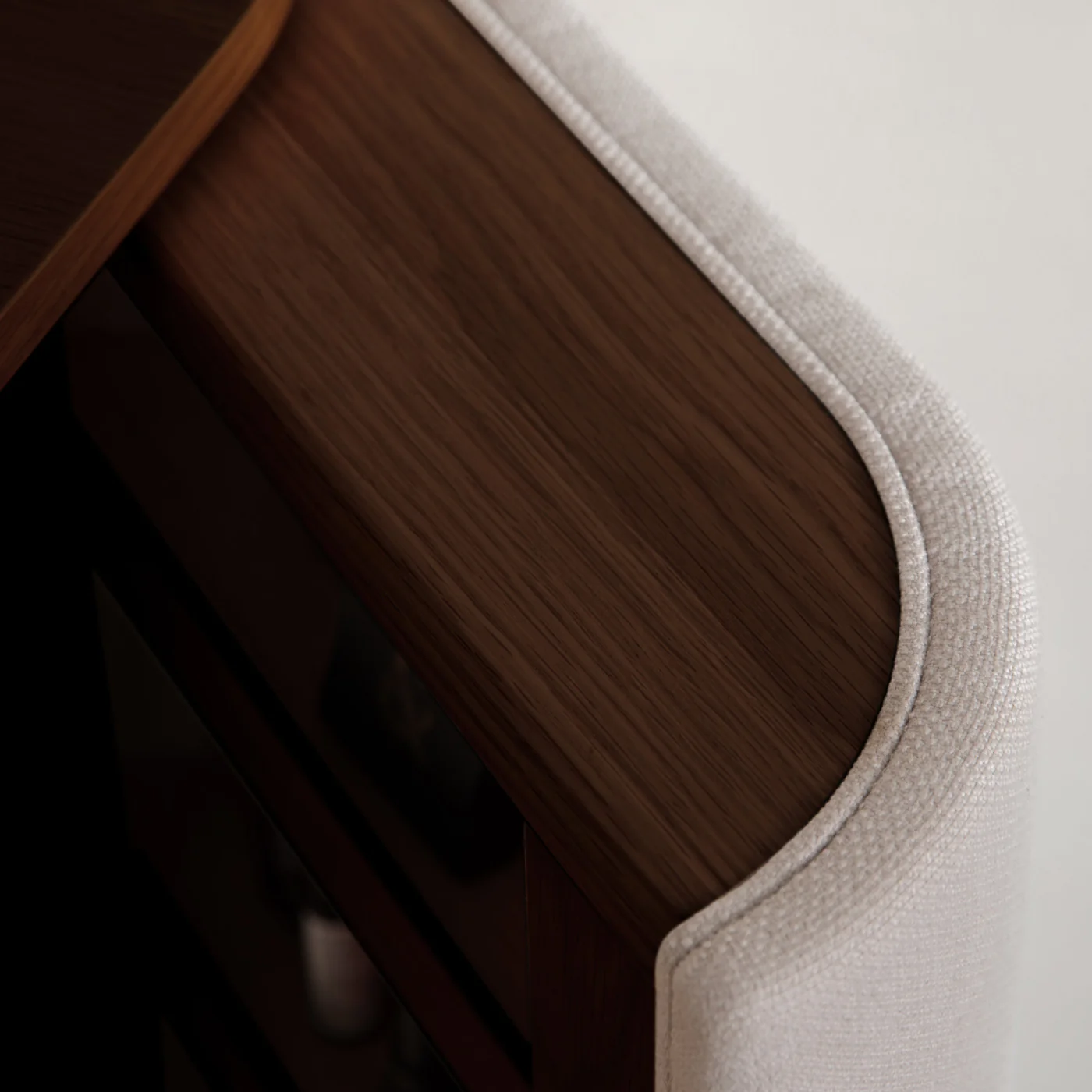 De zijpanelen openen als vleugels en bieden plaats aan sieraden, kleine accessoires of andere persoonlijke schatten. In het midden zorgen drie naadloos geïntegreerde lades voor royale opbergruimte voor knitwear, tafellinnen of kantoorbenodigdheden. Alles krijgt een vaste plek, zonder dat het meubel zwaar of massief oogt.
