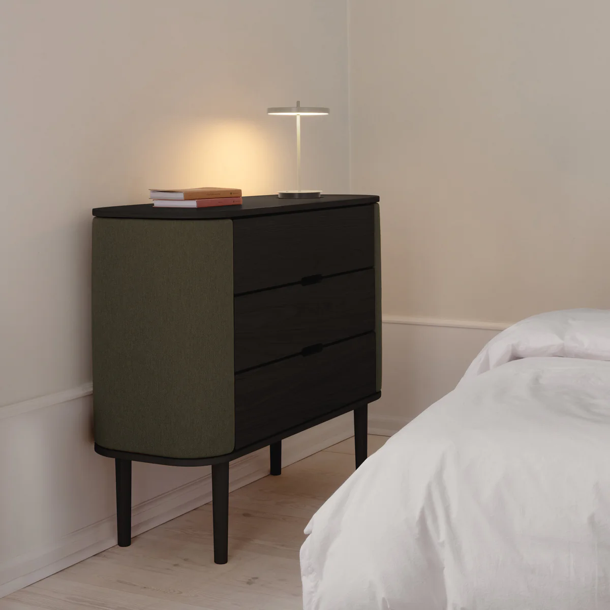 De Umage Treasures commode in zwarte eik met Morning Meadows afwerking verenigt verfijnde elegantie met doordachte functionaliteit. De zacht gebogen zijkanten geven het meubel een vriendelijke, bijna sculpturale uitstraling, terwijl de strakke lijnen zorgen voor rust en balans in het interieur.