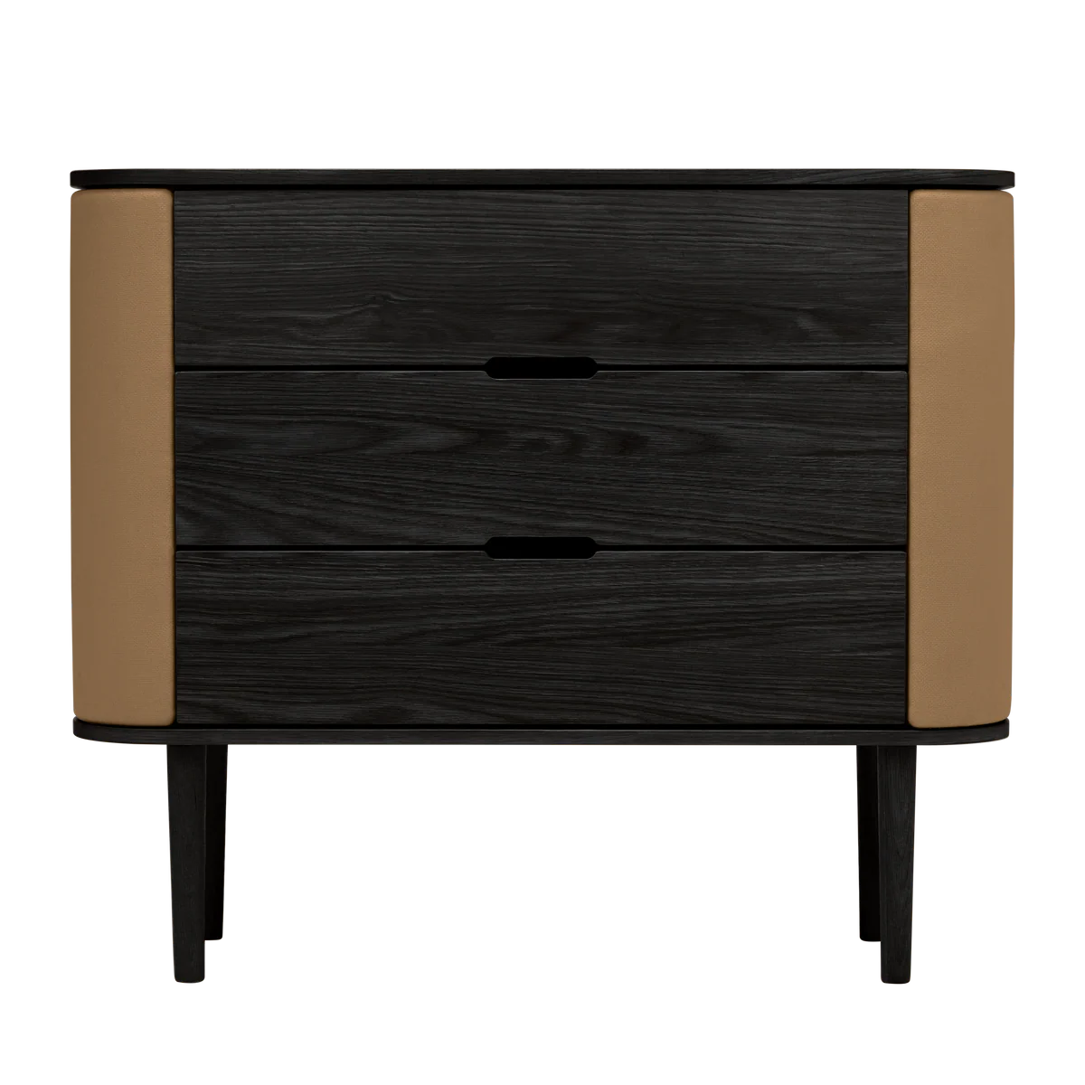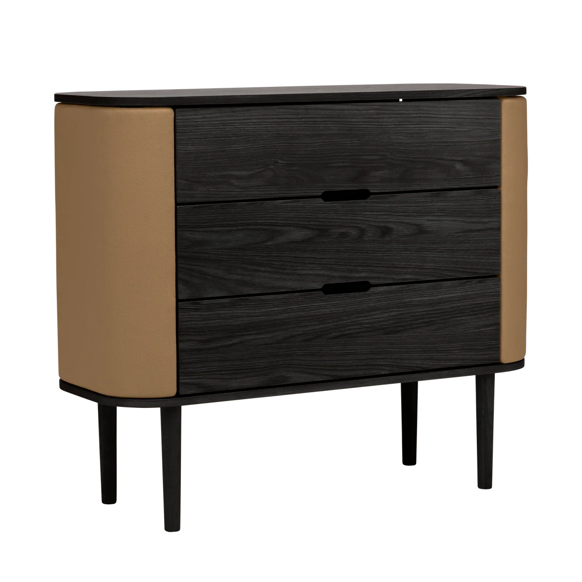 De Umage Treasures commode in zwarte eik met Sugar Brown afwerking verenigt verfijnde elegantie met doordachte functionaliteit. De zacht gebogen zijkanten geven het meubel een vriendelijke, bijna sculpturale uitstraling, terwijl de strakke lijnen zorgen voor rust en balans in het interieur.