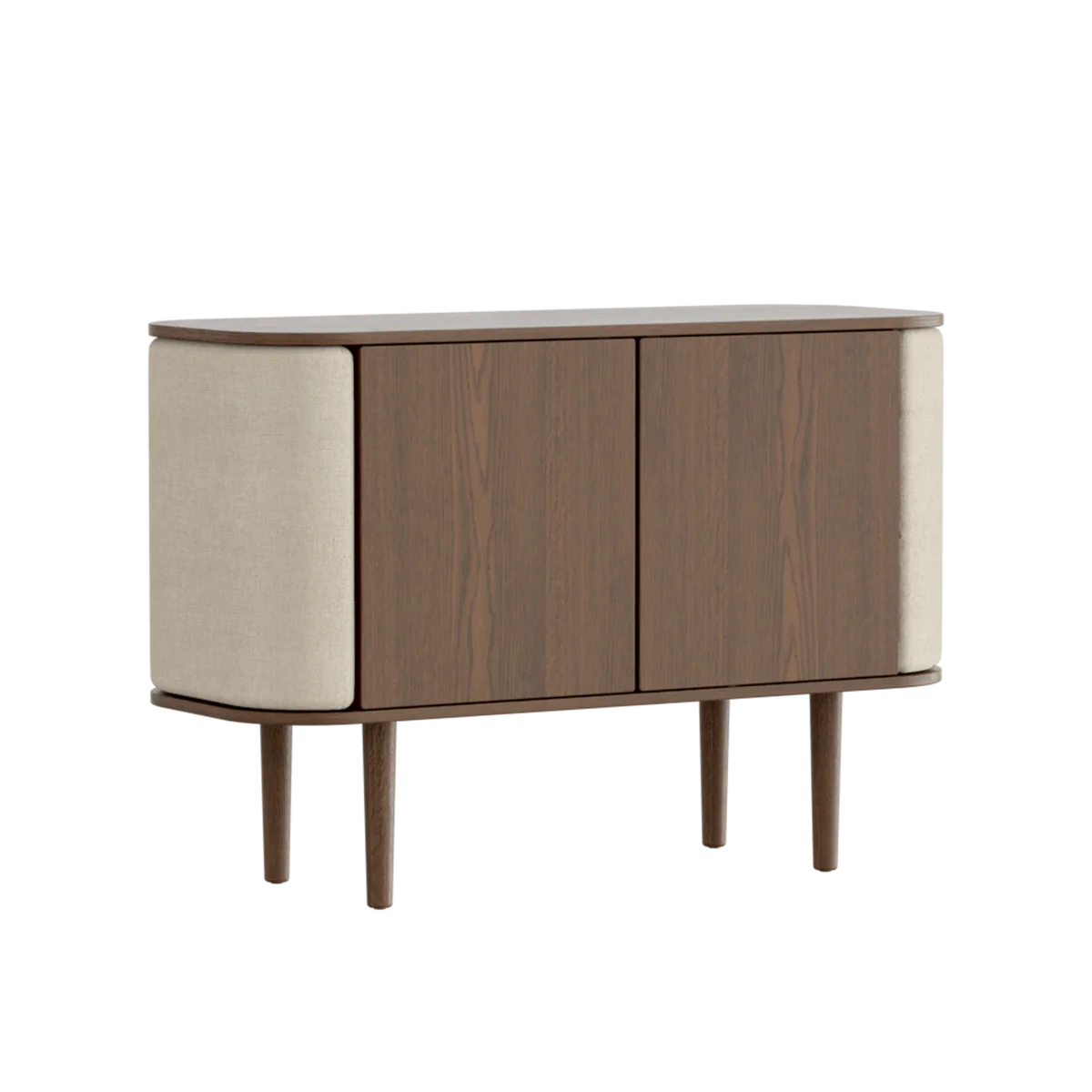 De Umage Treasures dressoir 2 deuren donkere eik – White Sands combineert tijdloze Scandinavische elegantie met functionaliteit en personaliseerbaarheid. De kast is vervaardigd uit hoogwaardig eikenfineer en wordt gekenmerkt door zijn zachte, afgeronde vormen en warmbruine tint. De gebogen zijpanelen zijn bekleed met een verwisselbare stof, waardoor het dressoir eenvoudig een nieuwe uitstraling kan krijgen zonder een volledig nieuw meubel aan te schaffen.