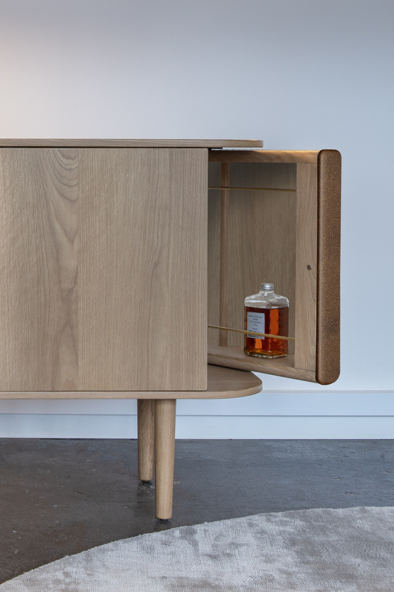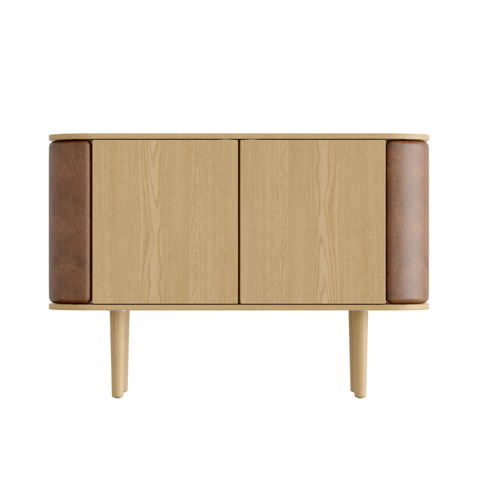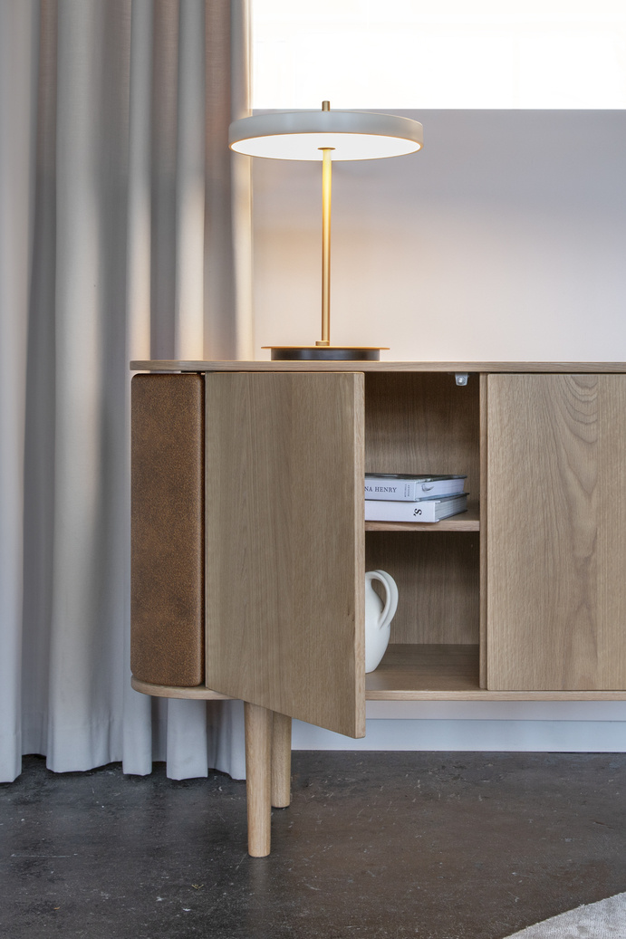 Elegant en personaliseerbaar dressoir in eikenfineer met verwisselbare zijpanelen en zachte Brown faux leather