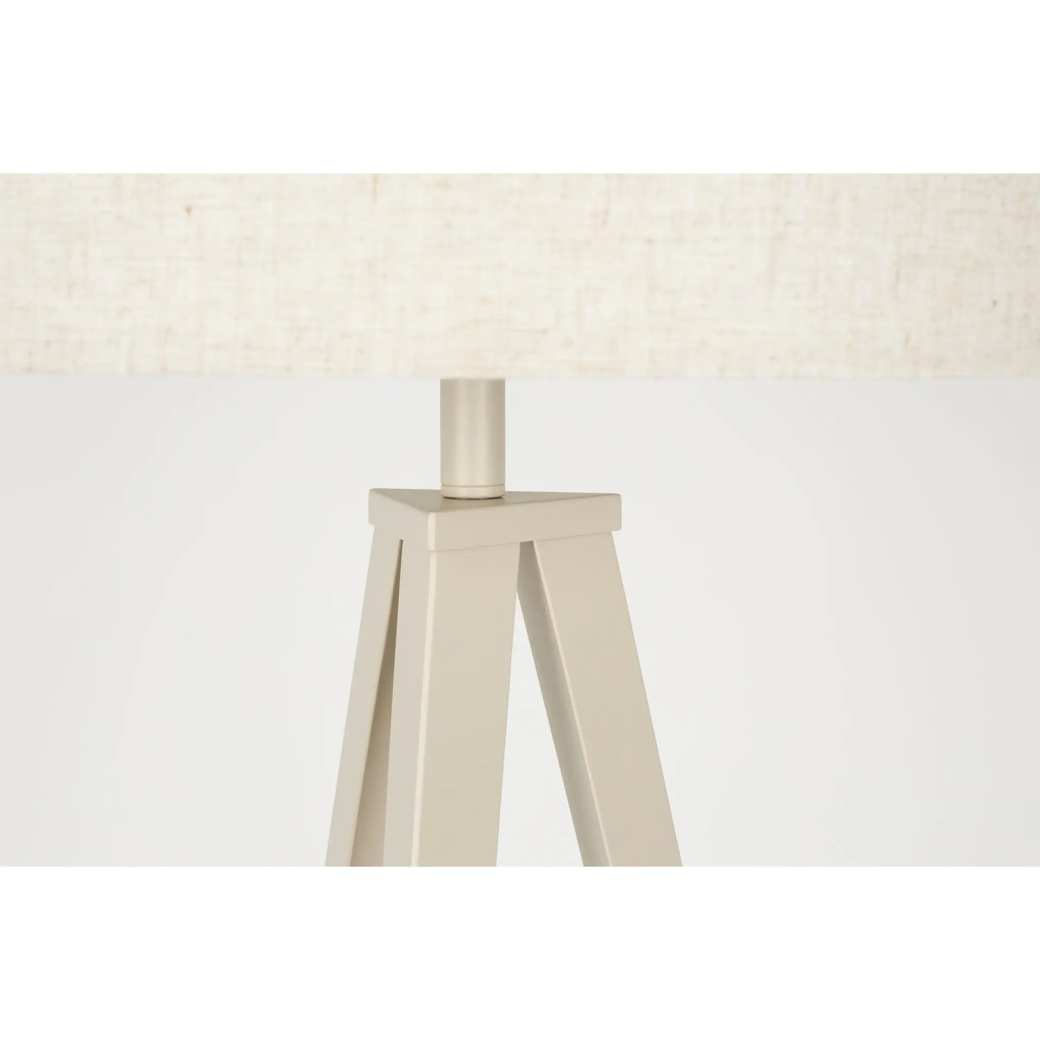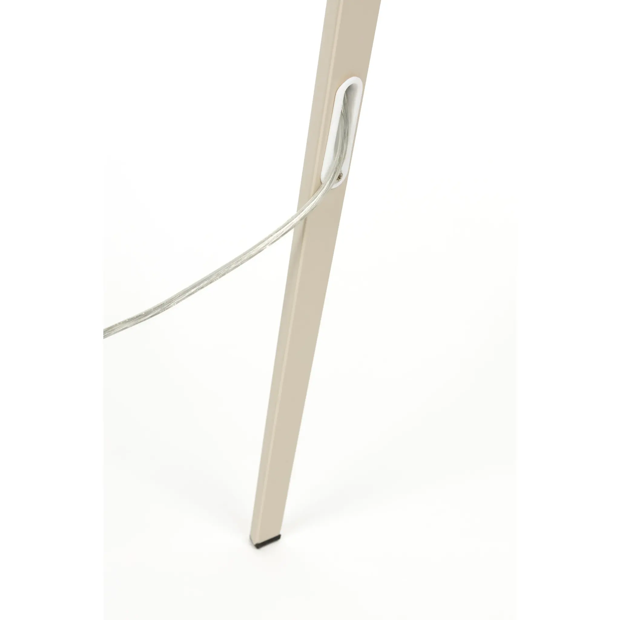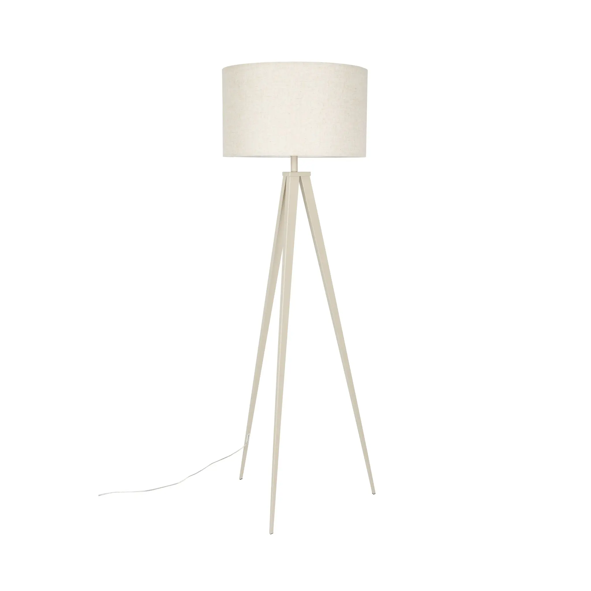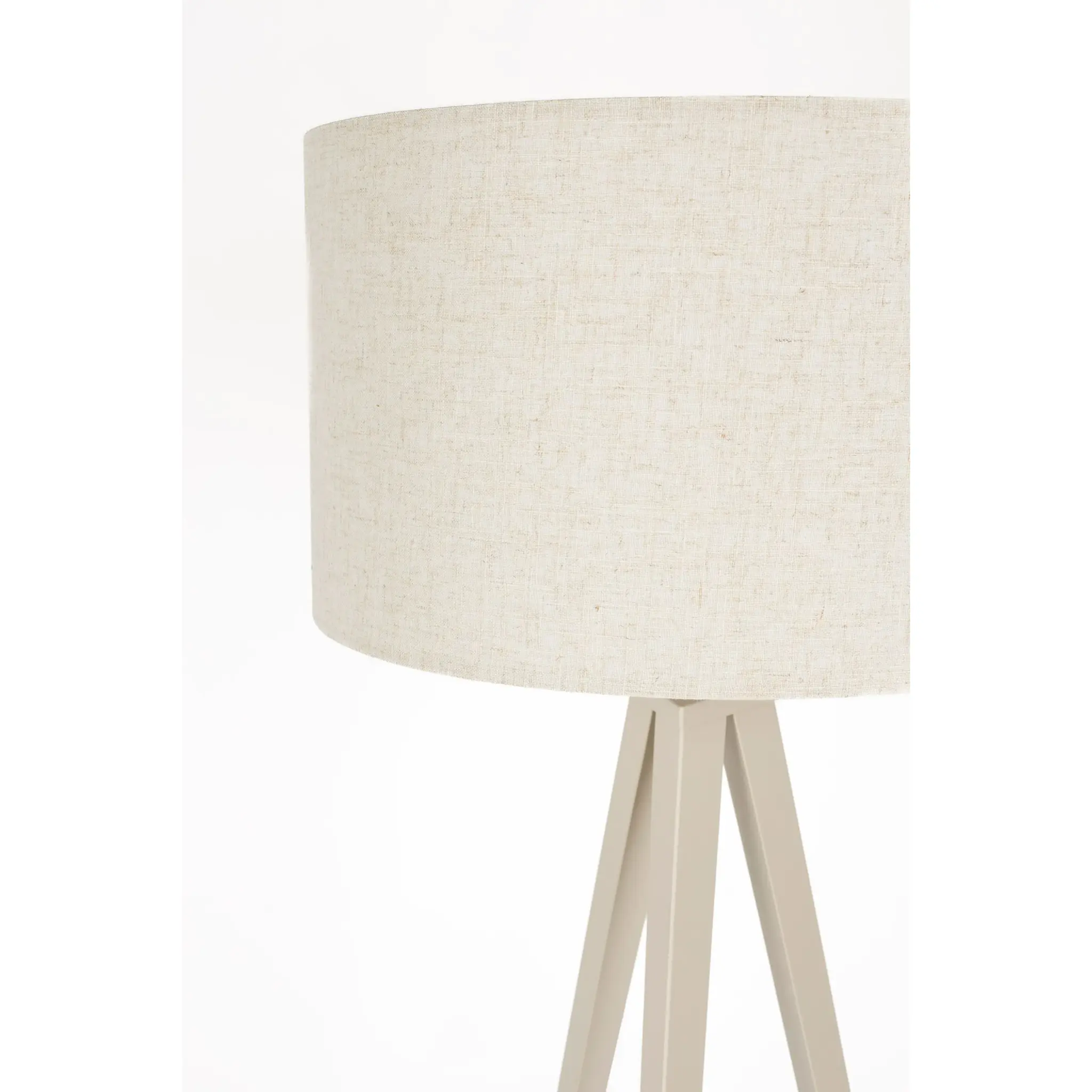 De beige kap zorgt voor een warme gloed, terwijl het metalen frame strak en luchtig blijft. Ideaal om een donkere hoek in je woonkamer, leeshoek of slaapkamer subtiel uit te lichten. De stroomkabel is slim weggewerkt in één van de poten en eindigt in een discrete voetschakelaar. Praktisch én mooi opgelost.