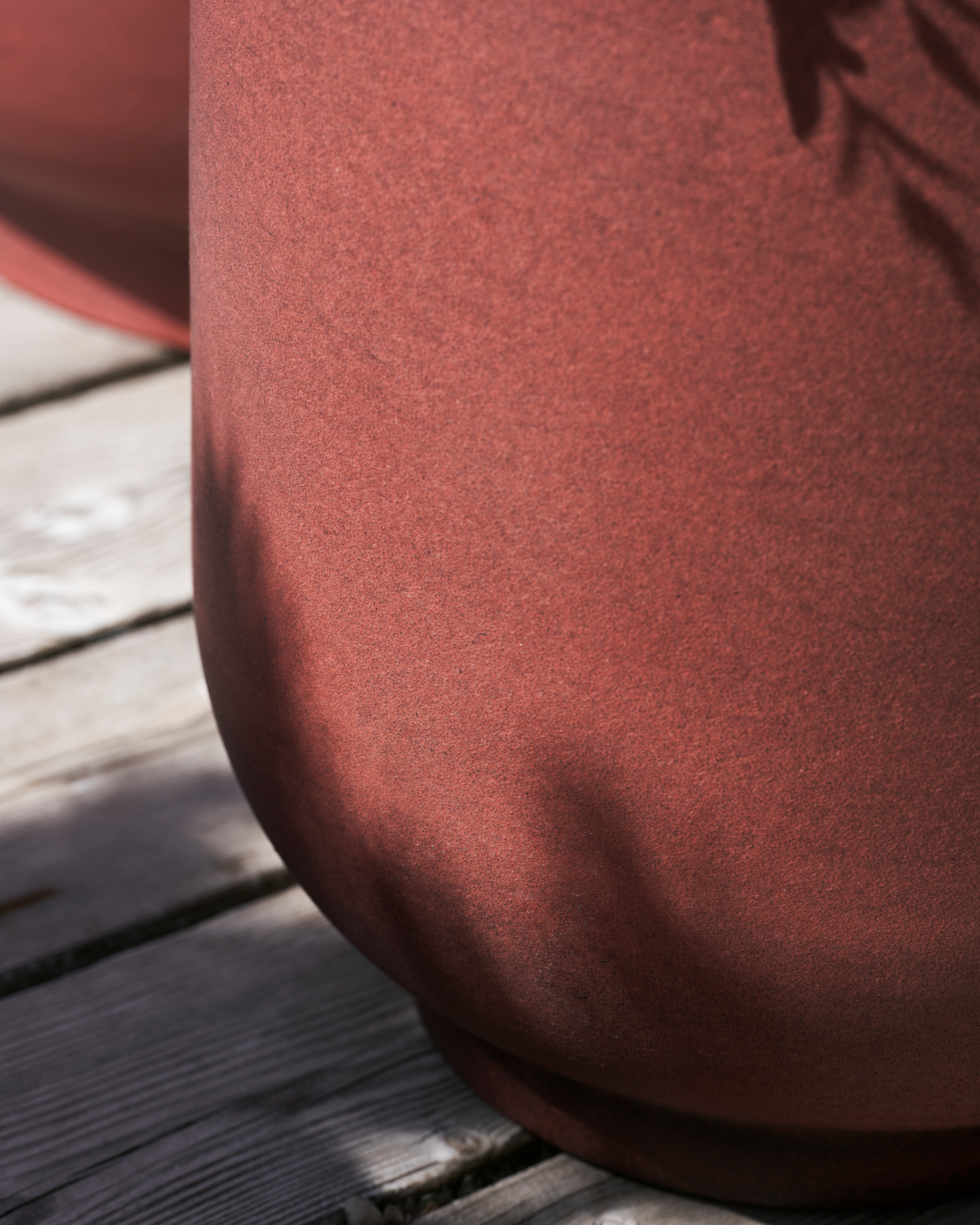 Deze bloempot in verschillende maten geeft je planten een stijlvol podium. Het opvallende roodbruine kleuraccent – burnt henna – en het strakke, ronde ontwerp maken deze pot tot een echt blikvanger. Hij is gemaakt van 100% gerecycled staal van autowrakken, wat zorgt voor een uniek karakter en subtiele variatie in afwerking en kleur. Dankzij het lichte gewicht verplaats je de pot eenvoudig, zowel binnen als buiten. Gebruik de pot op het terras, in de woonkamer, of zelfs als creatieve opbergruimte. Vriesbestendig tot -20 °C en geschikt voor alle seizoenen.