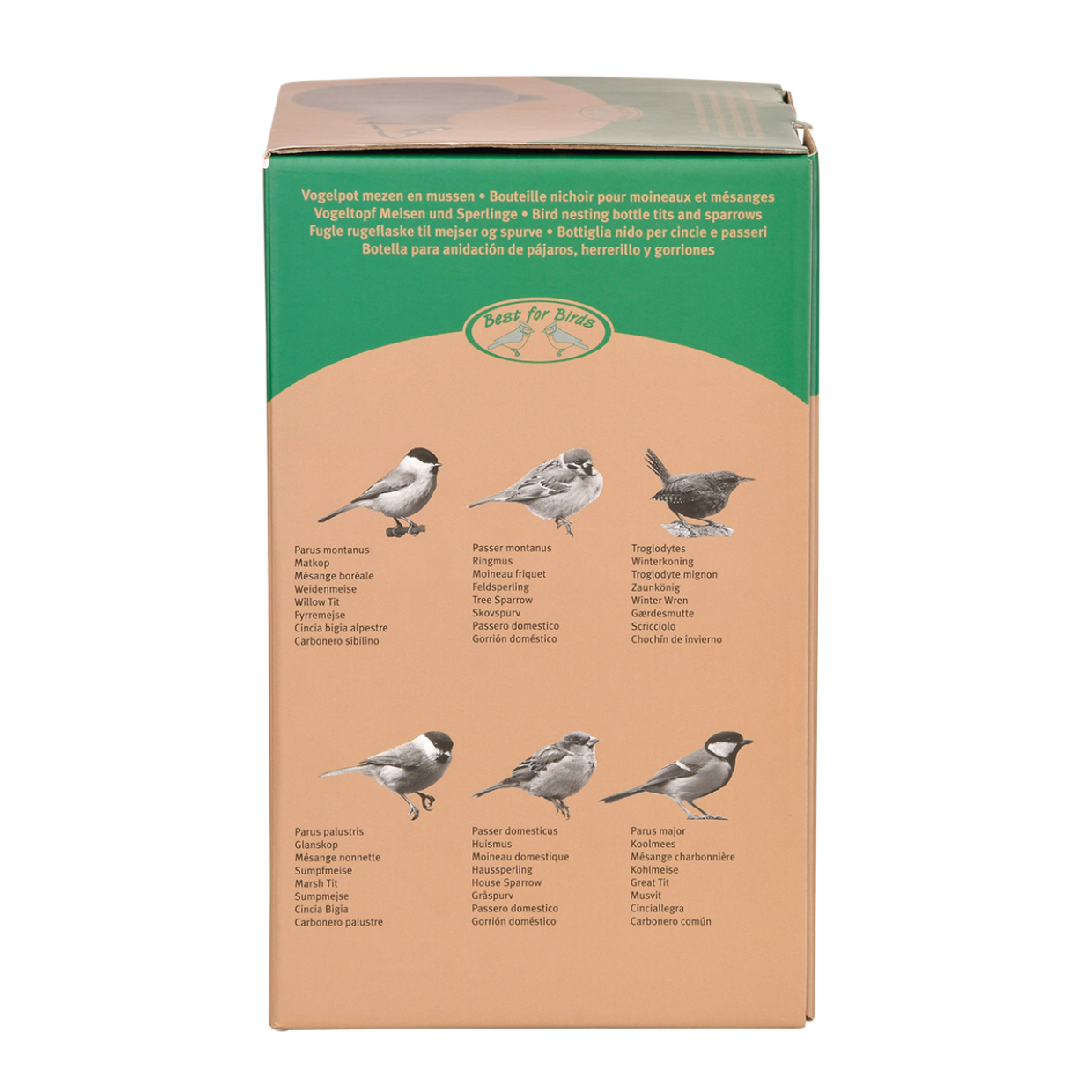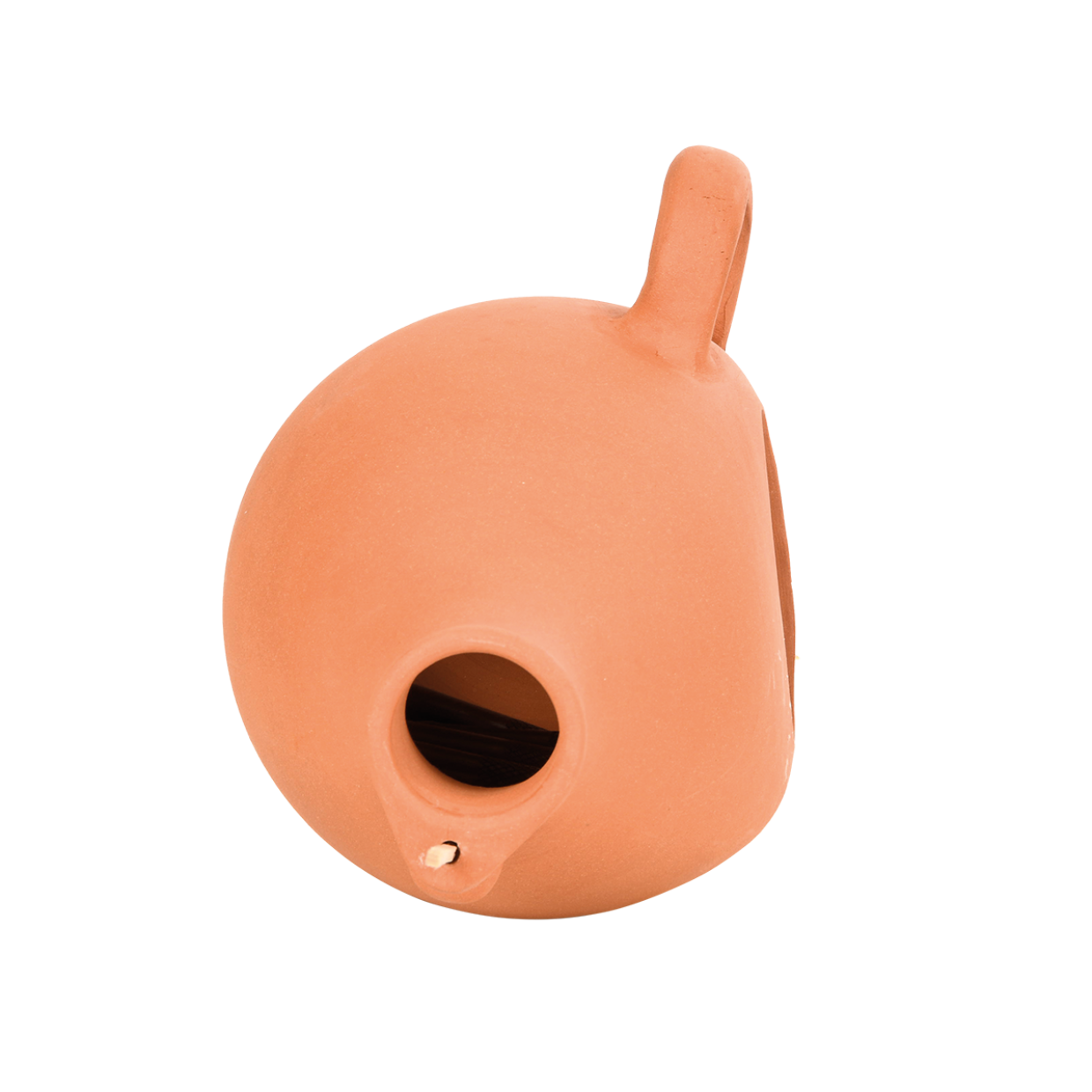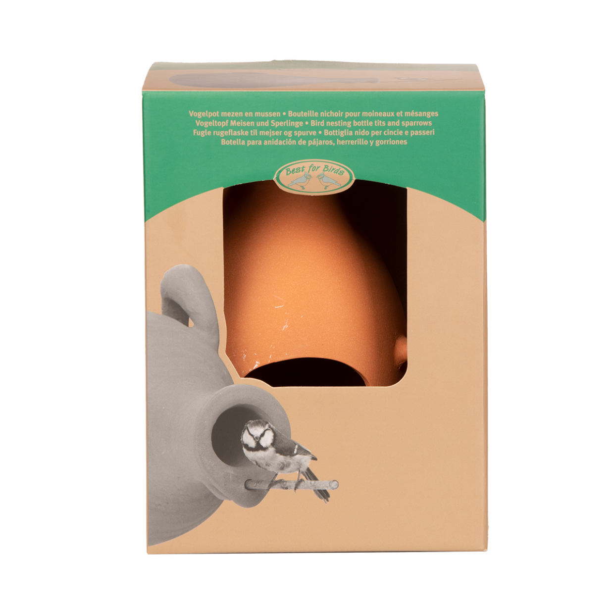 De vogelpot heeft een invliegopening aan de zijkant van 32 mm diameter. De pot komt ook inclusief aanvliegstokje en ophangoog.