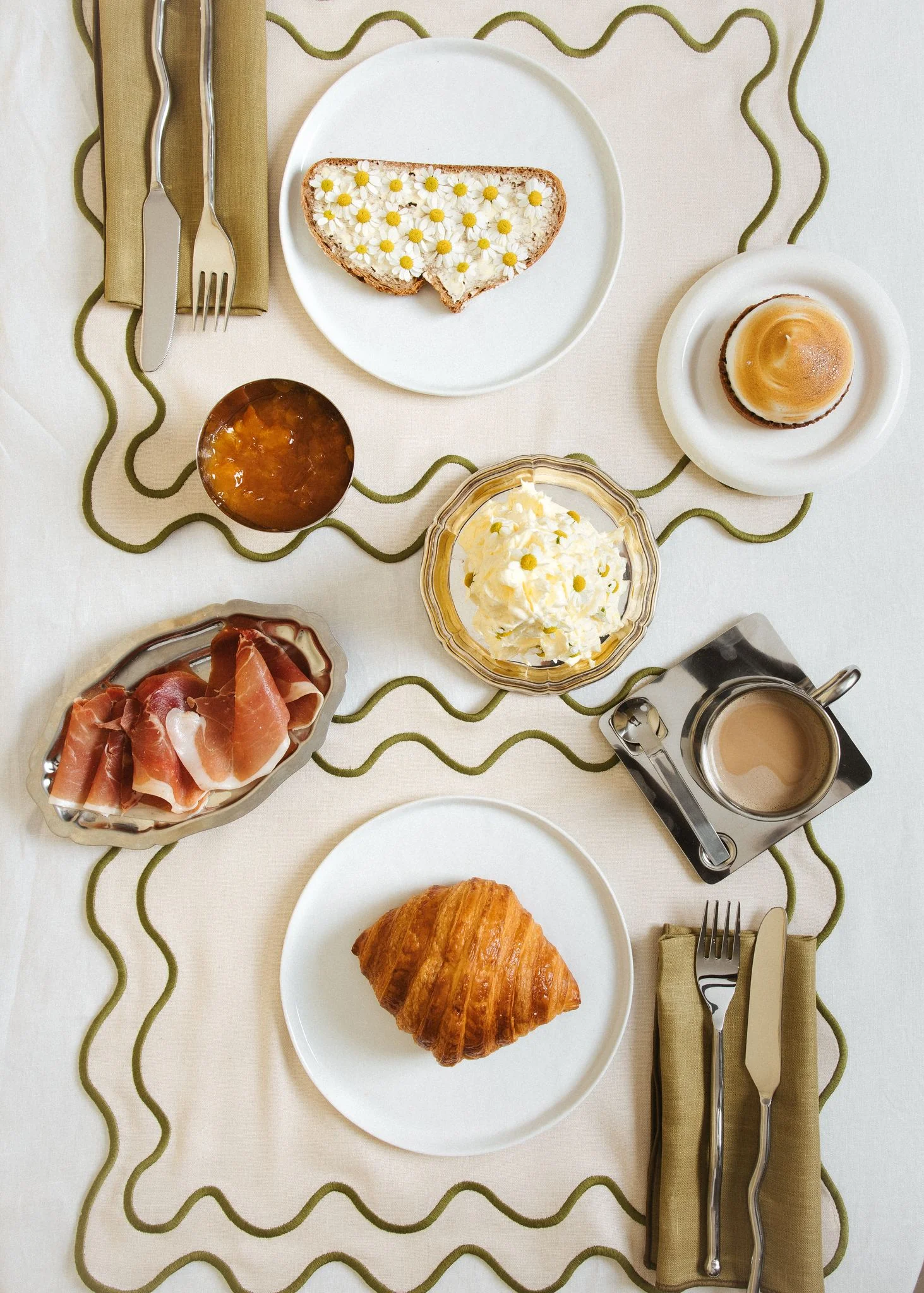Met deze Wavy placemats in beige en groen geef je je tafelsetting meteen een speelse, elegante toets. De golvende rand en het subtiele borduurwerk zorgen voor een verfijnde afwerking die zowel bij een minimalistische als bij een rijk gedekte tafel mooi tot zijn recht komt.