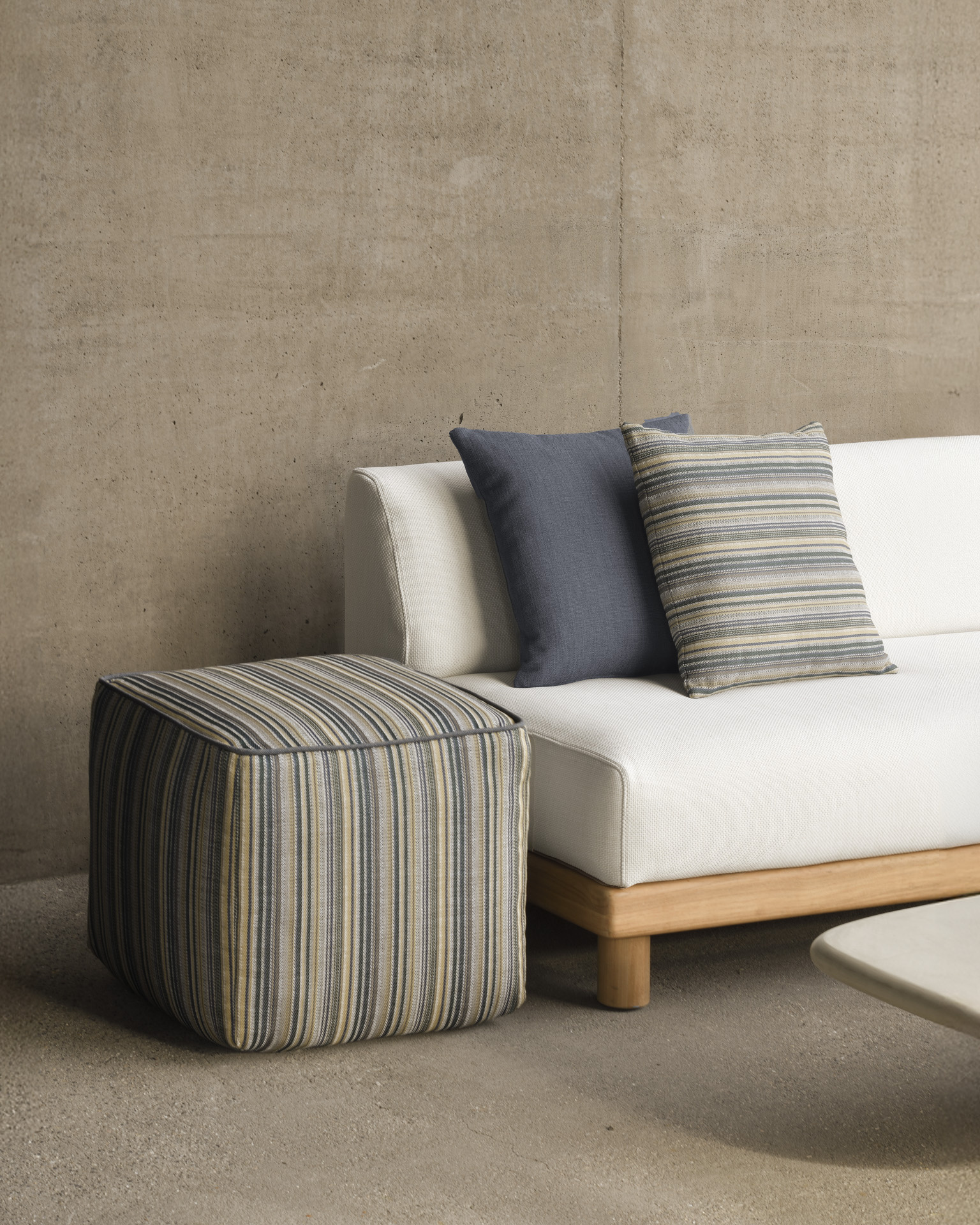 De Ethnicraft Zahara outdoor poef Blue Stripe is een vierkante poef met weerbestendige polypropyleen bekleding, sneldrogende vulling en een verfijnd biesdetail voor binnen en buiten. Lees meer