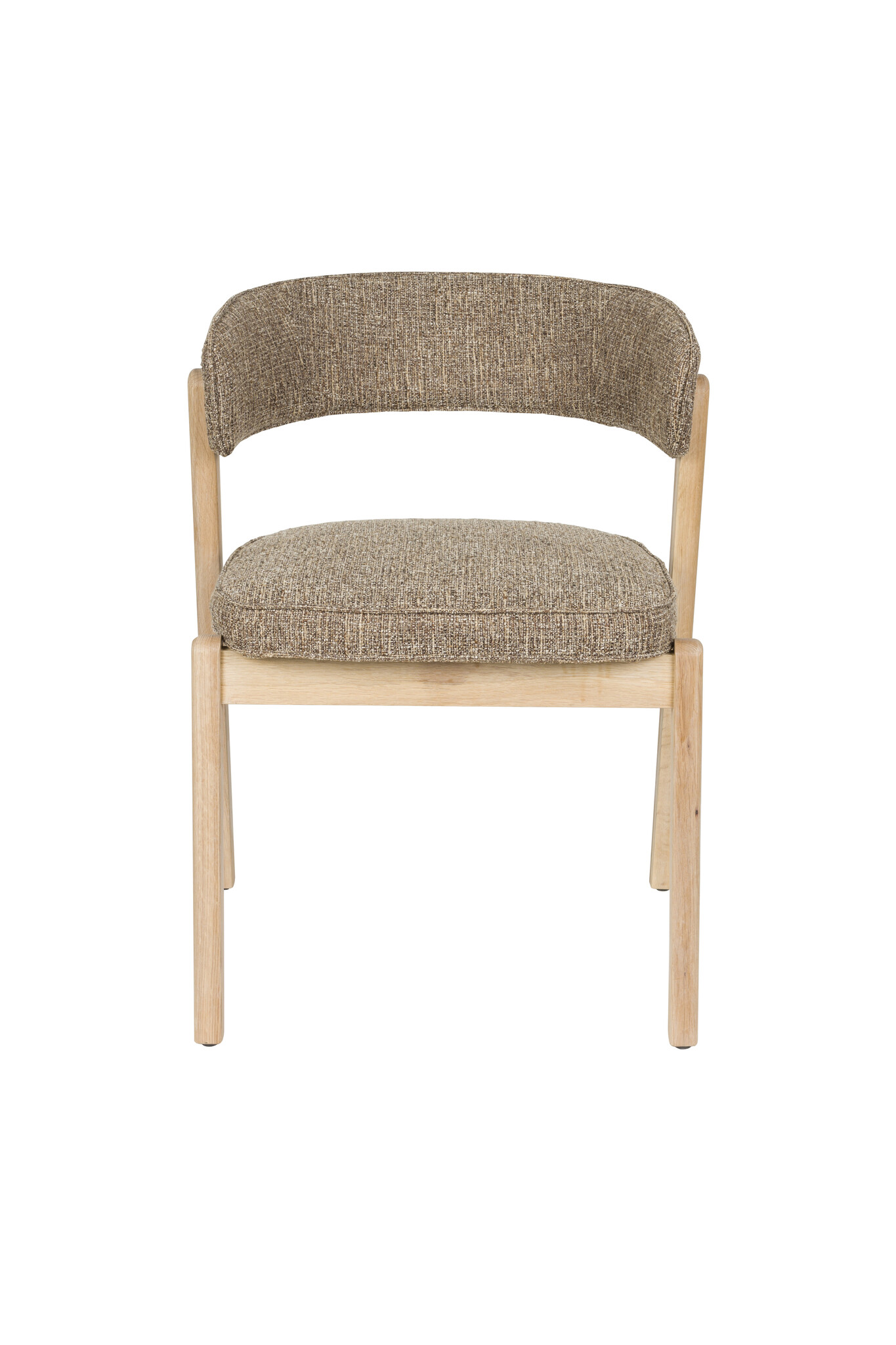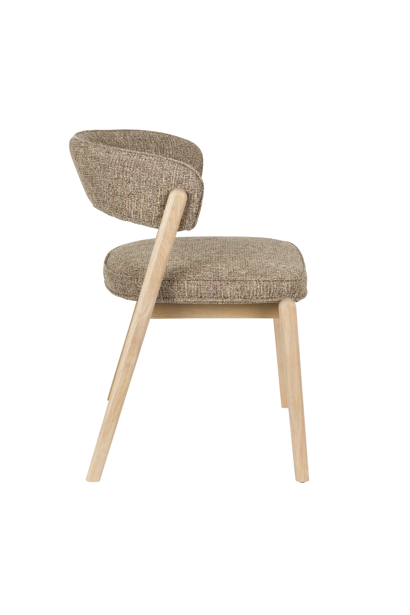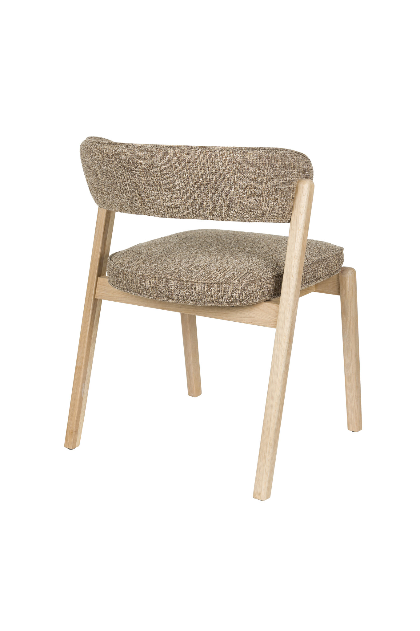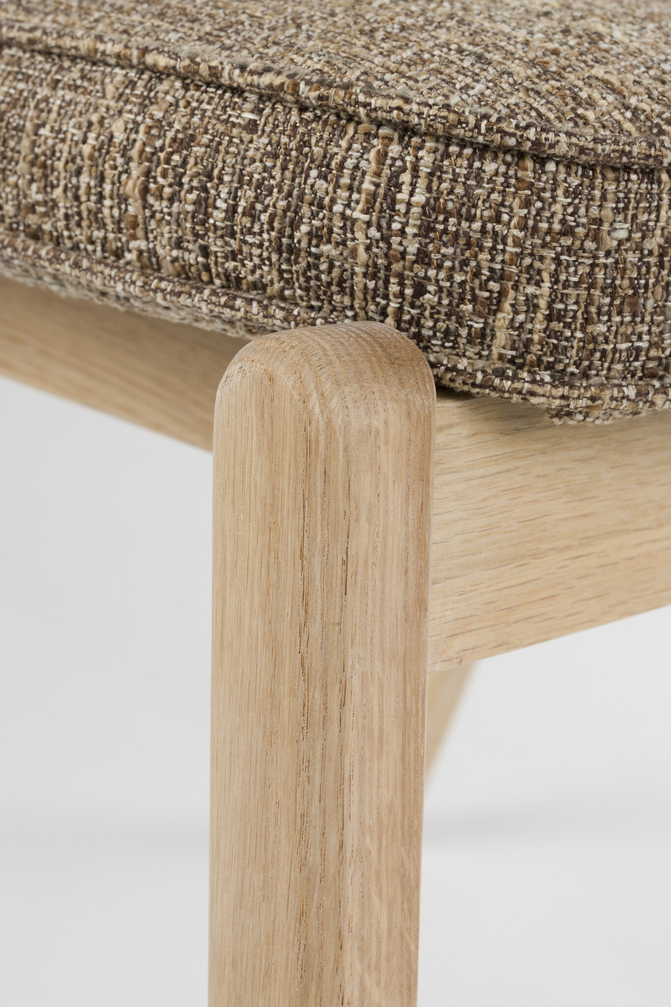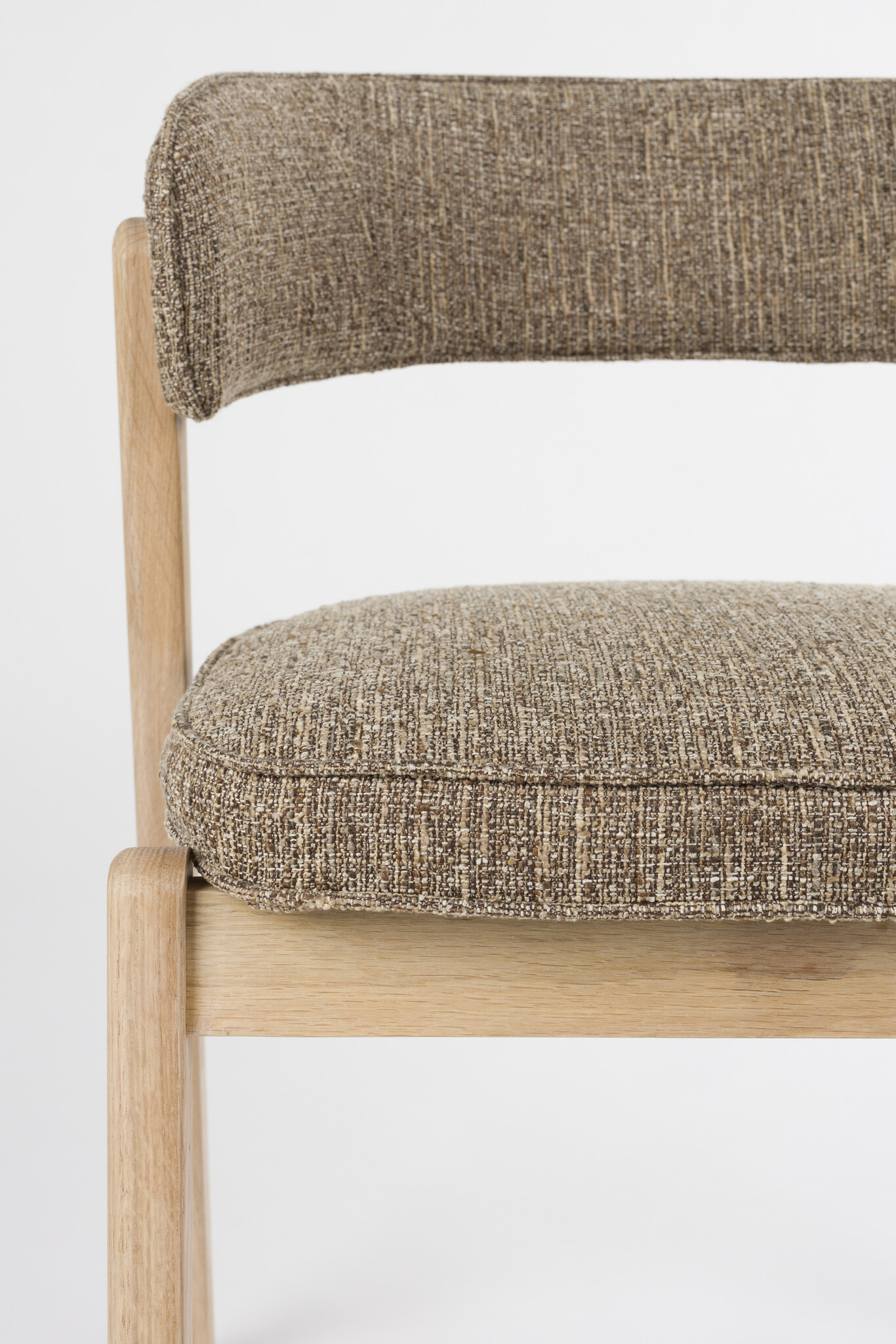 De Bright eetkamerstoel in bruin is een veelzijdige toevoeging aan elk interieur. Het lichte eikenhouten frame geeft de stoel een frisse en natuurlijke uitstraling, terwijl de zachte polyester bekleding met gestikte randen warmte en karakter toevoegt.
